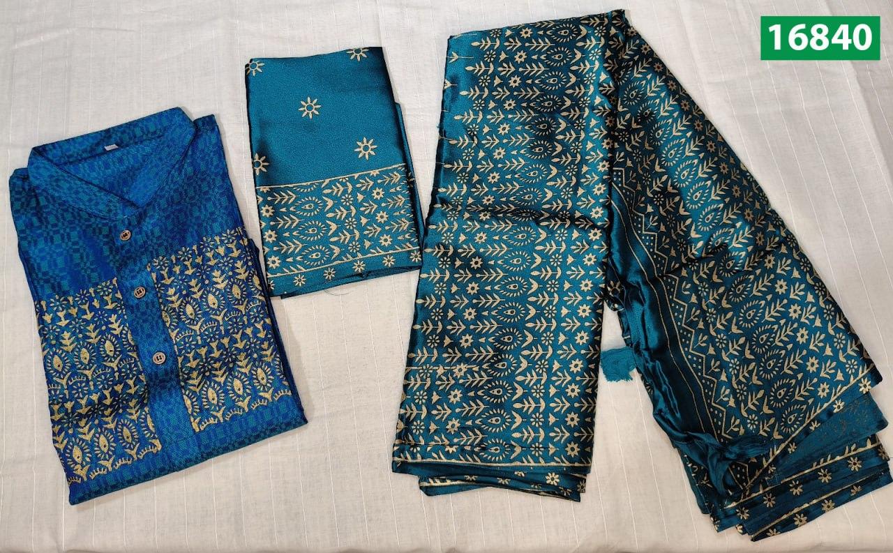 এই সেটের শাড়ীটি তৈরি করা হয়েছে উন্নতমানের জাপানি সিল্ক (Japanese Silk) দিয়ে, যা খুব আরামদায়ক এবং গ্লসি। এতে রয়েছে নজরকাড়া স্কিন প্রিন্টের (Skin Print) কাজ যা বেশ টেকসই। সাথে ম্যাচিং ব্লাউজ পিস তো থাকছেই।